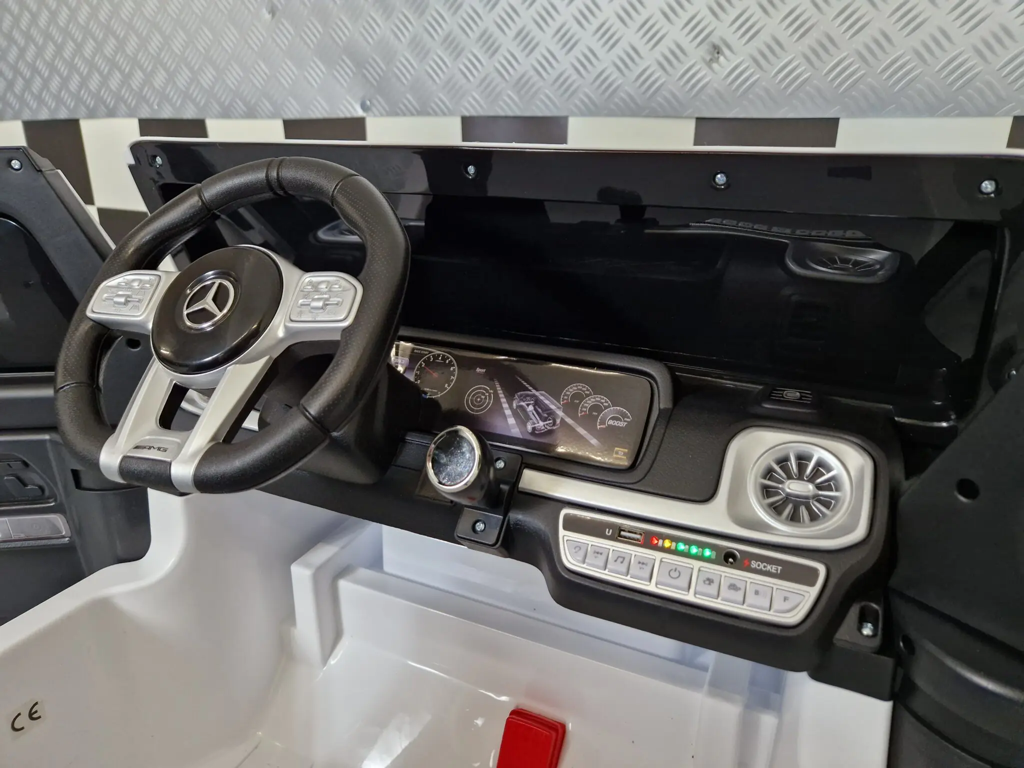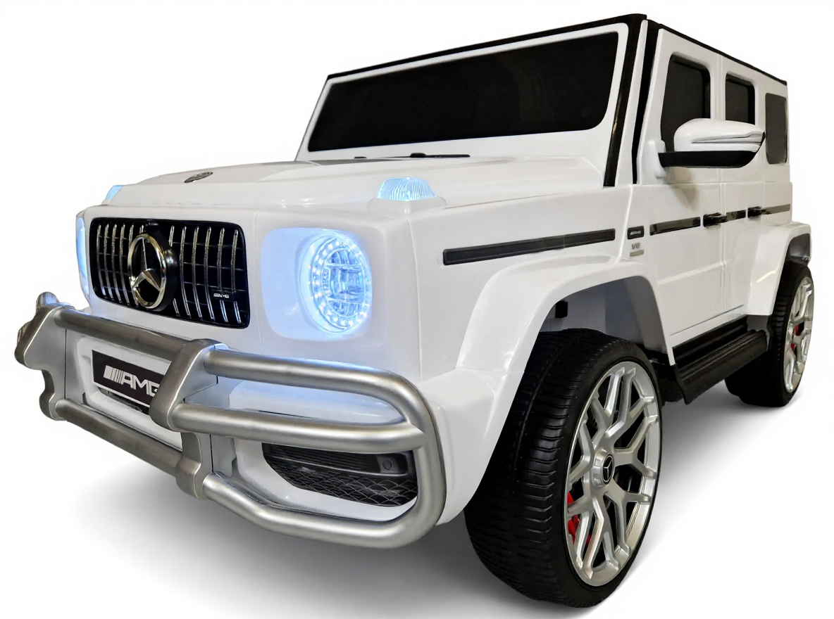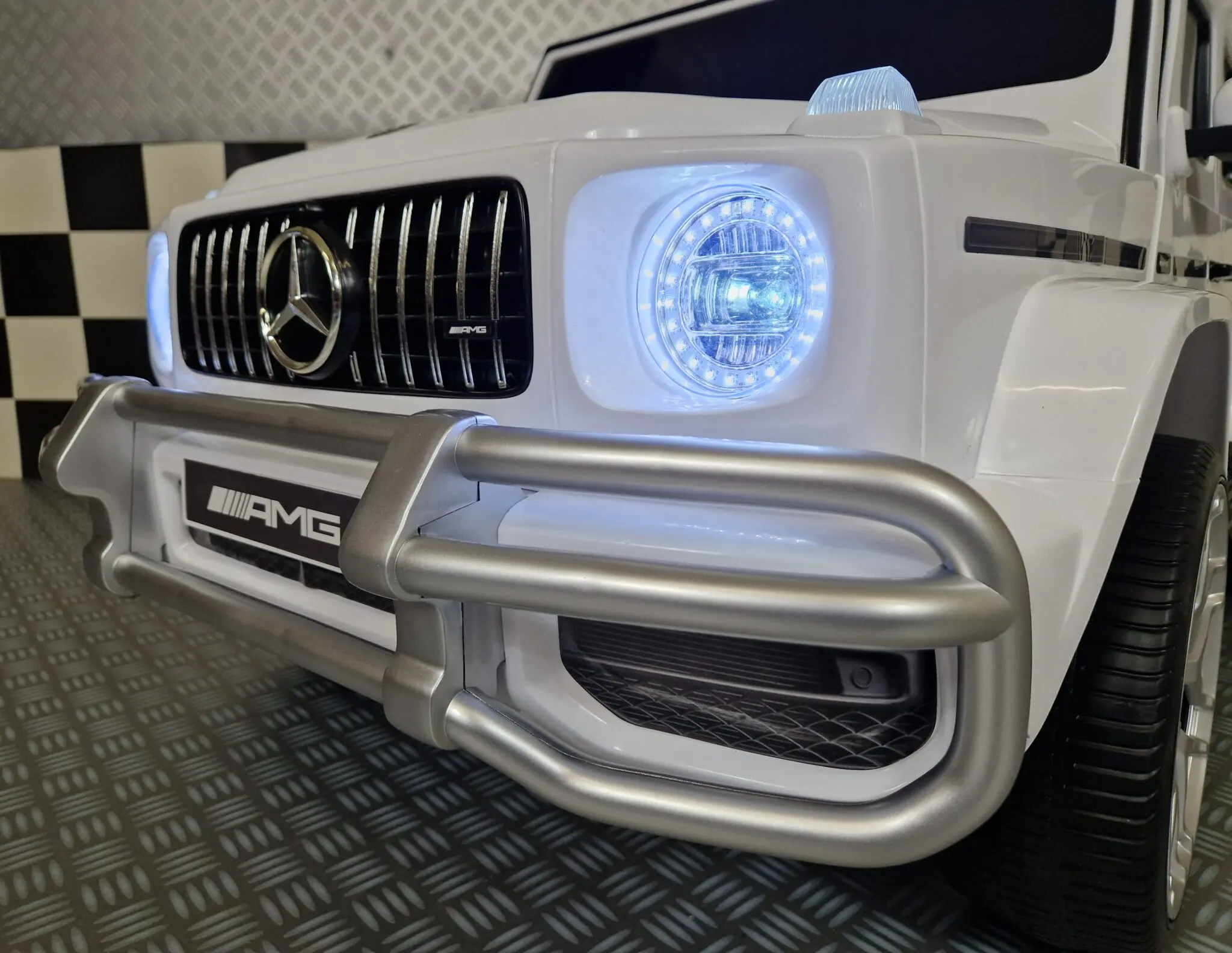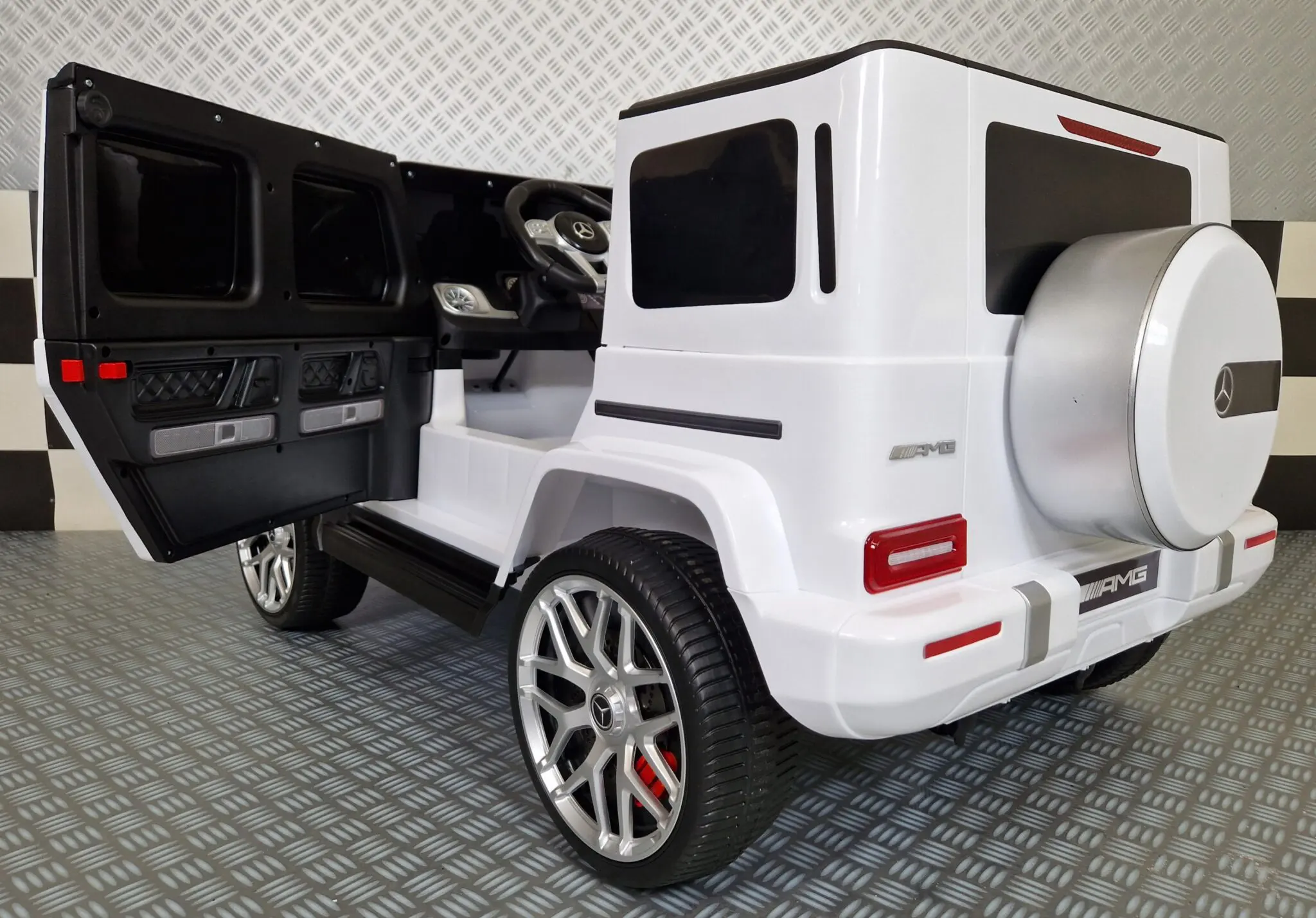 Das batteriebetriebene Kinderauto Mercedes G63 AMG verfügt über ein Radio, einen MP3-Player, einen USB-Anschluss, einen SD-Kartenleser und verschiedene Sounds. Das elektrische Mercedes-Kinderauto hat außerdem Lichter. Es hat echte Türen zum Öffnen und erreicht eine Geschwindigkeit von ca. 3 bis 8 km/h. Mit dem Schalthebel kann der Mercedes vorwärts oder rückwärts fahren. Dank des (klappbaren) Griffs an der Vorderseite und der Räder an der Unterseite des Autos ist es leicht zu transportieren!